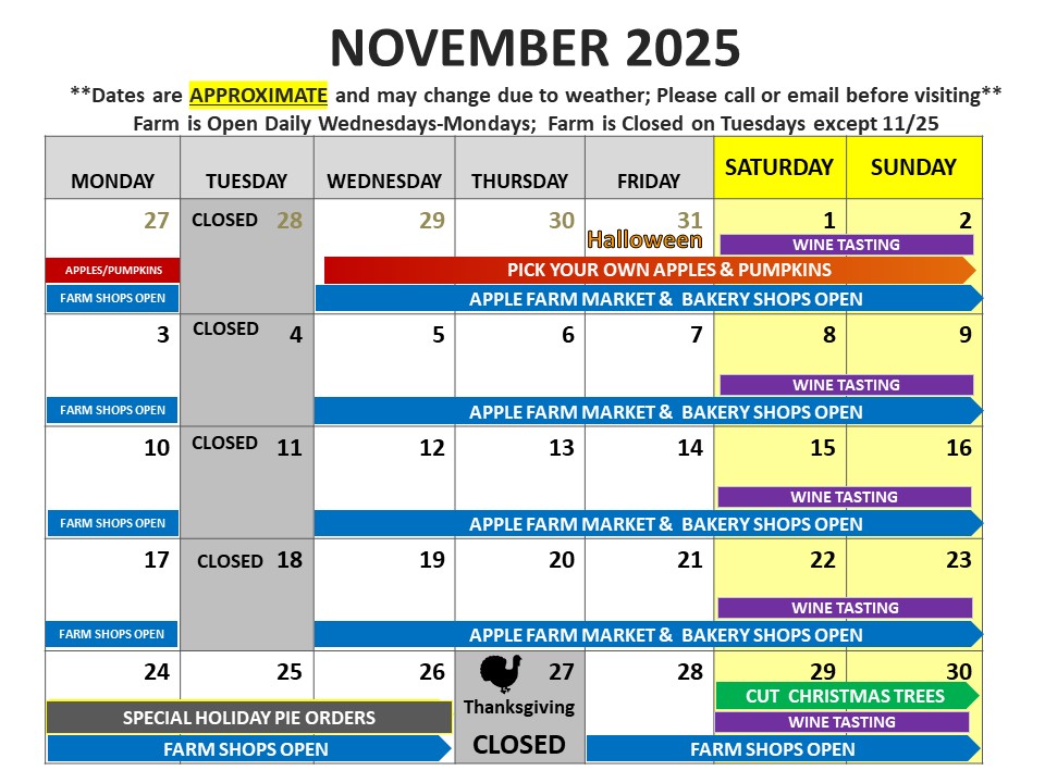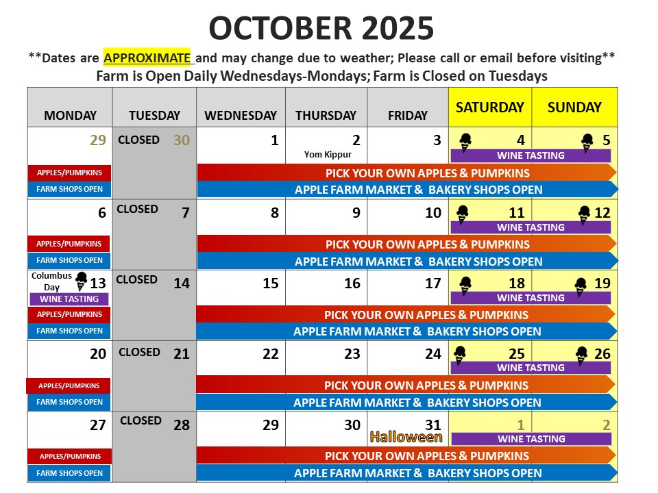 Here is our 2025 Harvest calendar with the APPROXIMATE dates that we were open. Please note the BEST time to pick APPLES is SEPTEMBER.